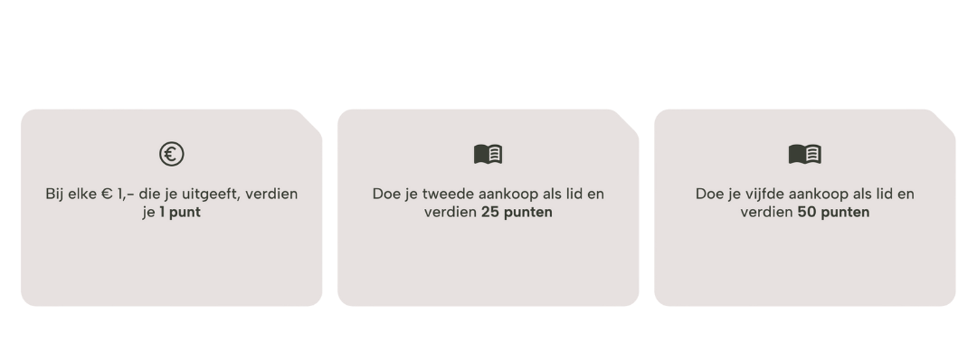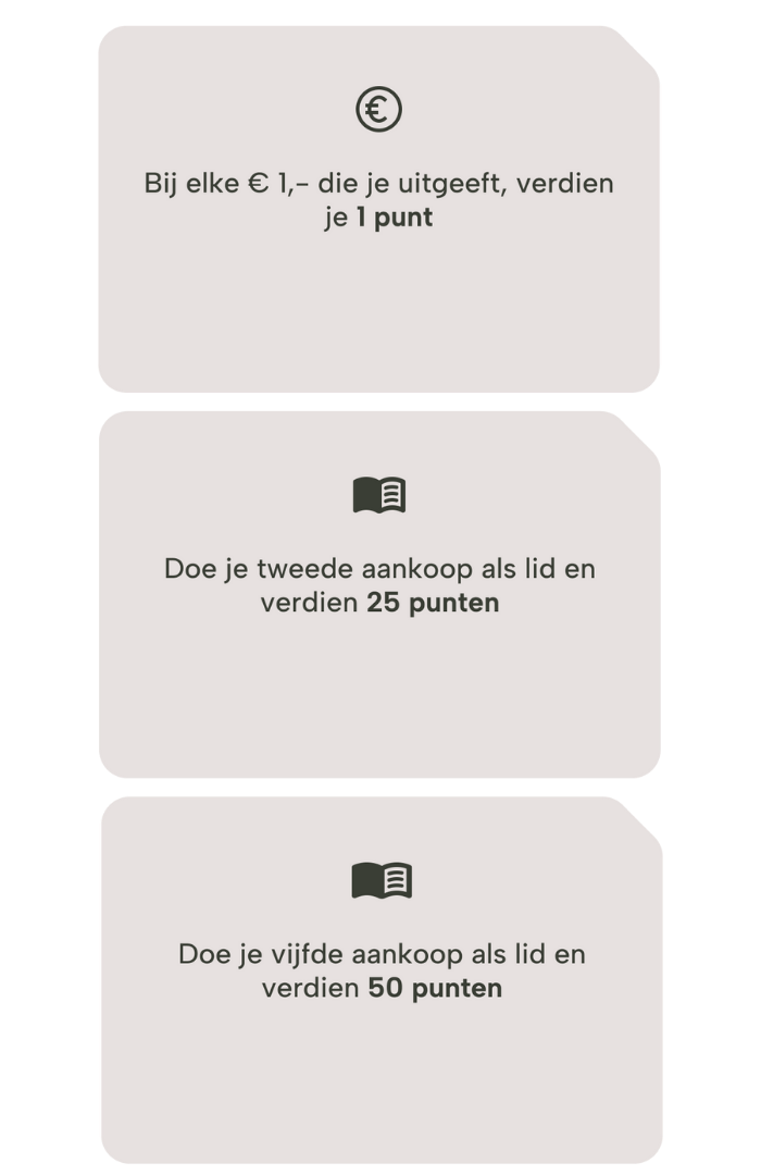 Heb je 50 punten verzameld? Dan ontvang je een voucher ter waarde van €2,50 en bij 100 punten krijg je zelfs een voucher van €6,00. Deze vouchers zijn te vinden in je account. Houd er rekening mee dat je slechts één voucher per keer kunt gebruiken. Dit doe je door op ‘verzilveren’ te klikken. Heb je je vouchers opgebruikt? Geen zorgen, je kunt gewoon verder sparen. Hoe werkt dit? Elke euro die je uitgeeft is gelijk aan 1 punt.